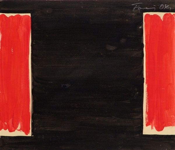 Jiro Yoshihara created this painting with oil on canvas, typical materials for the mid-20th century. Yet Yoshihara was interested in something more radical than traditional painting. Notice how the black background is applied evenly and opaquely, while the white outline has a rough, almost accidental quality. Yoshihara was the leader of the Gutai group in Japan, who sought to move beyond the cool perfection of abstraction, and instead celebrate the gesture and the mark of the artist. The Gutai artists were adamant that materials should be allowed to 'live,' to find their own form. Here, you get the sense that Yoshihara has set the stage – black paint – then released his intuition to fill it, trusting in the expressive potential of a simple white line. By focusing on process and gesture, Yoshihara sought to collapse the distinction between art and action.