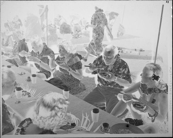 Editor: This is a photographic print, "Untitled (children's party)" by Lucian and Mary Brown. The image is ghostly, dreamlike. What strikes you most when you look at it? Curator: The clustering of figures, the repetition of faces, evokes a sense of communal memory. The image echoes rituals—birthdays, holidays—embedded in our collective consciousness. The party hat, a symbol of celebration, appears almost totemic here. What feelings does this evoke in you? Editor: A sense of nostalgia, definitely. It makes me think about how childhood memories get distilled into a few key images. Thanks, that’s a fresh perspective on a simple photograph. Curator: Indeed, the power of images lies in their ability to condense complex emotions and cultural narratives.