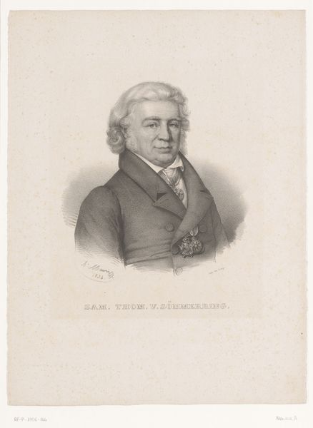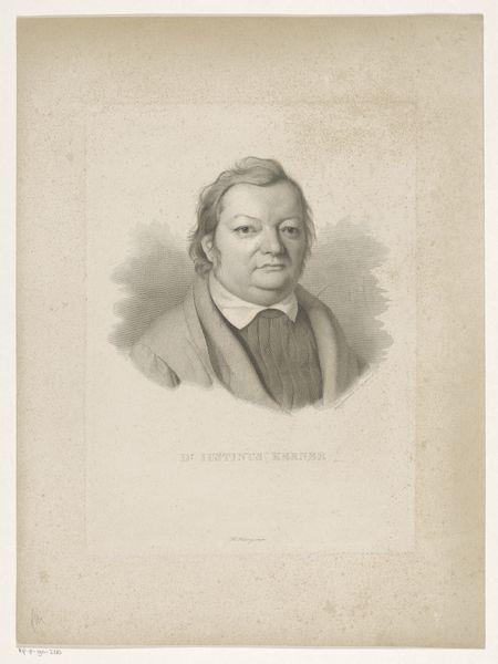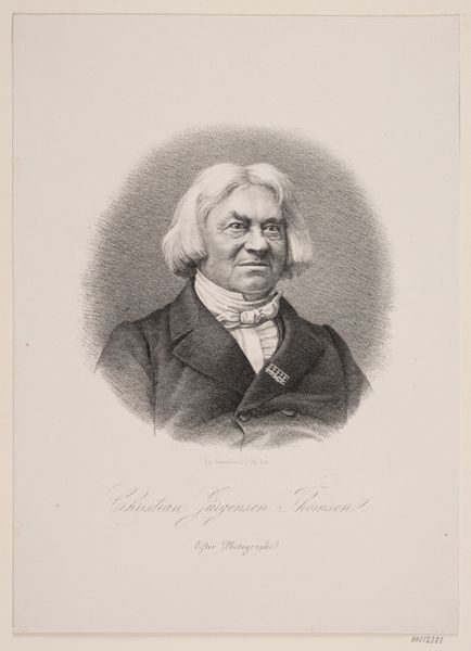 Editor: This is a lithograph and graphite drawing from 1865, titled "C.J. Thomsen." The rendering feels pretty direct and stoic. What do you see in this piece that maybe I'm missing? Curator: Ah, yes, Thomsen, the father of archaeology. I look at this image and I think about time, don't you? He dedicated his life to categorizing ancient artifacts; now, ironically, we're peering back at *him* through the looking glass of history. He looks rather serious, wouldn't you say? A man deeply immersed in thought, I'd wager. What do *you* feel when you look at him? Editor: I do get a sense of seriousness. And also permanence, considering it's a print. The graphite gives it a really neat textured look as well. Did portraiture serve a different purpose back then? Curator: Hugely! Before photography, portraits like these were vital. Not just for recording likeness, but also for communicating status and character. He probably sat for quite a long time so that the artist could carefully achieve the exactitude for this work. I think the artist certainly wanted to create the impression that this was an intellectual giant. Do you feel that he succeeds? Editor: I think the direct gaze definitely contributes to that impression. Plus, there's something authoritative about how solid he looks in the drawing. Curator: Right! It also made me think: How will *we* be remembered, or perceived, through the art and images we leave behind? It's all a question of how we curate the self, isn't it? Editor: Totally. It’s incredible to think of the layers of meaning contained within a single portrait. This was fun. Thanks!