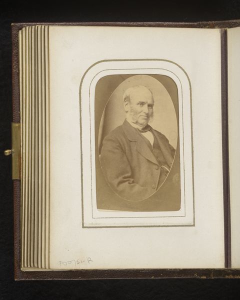 Curator: This photograph, simply titled "Portret van een man," or "Portrait of a Man," comes to us from the lens of photographer Victor, dated sometime between 1860 and 1900. It's a gelatin-silver print. What are your first thoughts? Editor: Sepia tones always lend a sense of nostalgia, don't they? It's quite soft, almost dreamlike. The man’s pose feels very staged and composed, hinting at formality but his slightly softened, blurred edges betray vulnerability. Curator: Absolutely. Let’s consider the gelatin-silver printing process. Its emergence was revolutionary. Compared to earlier photographic methods, it allowed for shorter exposure times and greater detail. This print offered a cost-effective way to produce portraits for a growing middle class. Editor: I'm drawn to the symmetrical balance within the frame. The portrait’s position inside the oval window accentuates a very stable pyramidal structure and contributes to the solemnity. I want to inquire more about the emotional aspect of his look. Curator: Well, in that era, studios like Victor's often operated on a small scale, employing local workers and catering to the community. These photographic studios filled the role of portrait painters, capturing likenesses that marked milestones or preserved memories. He may have felt a great amount of pressure as an entrepreneur. Editor: Looking closely, the way the light catches the slight details, is intriguing, especially on his eyes and whiskers, despite the somewhat soft focus. It would be good to look further into its connection to period painting. Curator: It would, indeed. Consider also that portraiture became more accessible, democratizing art production and consumption. It raises questions about who was included and excluded in this visual record. Editor: I think what impresses me most is the feeling it exudes in the context of history. Despite its technical elements, the essence it has seems universal. Curator: Agreed. Ultimately, whether seen through a materialist or formalist lens, "Portrait of a Man" provides a tangible link to the past.
