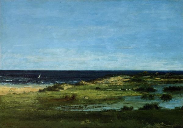 Editor: Here we have Sir John Lavery's "The Golf Course, North Berwick," painted in 1922. It's an oil painting and the colors feel very muted, almost dreamlike. What stands out to you? Curator: Notice how Lavery positions the horizon line low, emphasizing the vastness of the sky. What does that evoke for you? Blue has long been a symbol of melancholy and contemplation; but observe also the dynamic interaction between earth and sky, suggesting the transient nature of experience. Golfers are rendered as insignificant and fleeting forms, almost overwhelmed by nature. What deeper, perhaps psychological, narratives could that layering point toward, do you think? Editor: It definitely makes the people feel small, like they're at the mercy of the elements. Almost like nature is indifferent to their game. But the game of golf is about taming nature! Curator: Precisely! Herein lies the symbolic tension. Golf itself could be seen as a metaphor for our attempts to impose order onto a chaotic world, yet the ever-present sky subtly undermines this human ambition. What happens to symbols as we begin layering more humanistic activities onto primal settings? Consider, too, the broader historical context. Post-World War I, perhaps this work meditates on the futility of control in the face of overwhelming events, a recurring artistic response to societal trauma through art. Editor: That makes me think differently about the entire composition. So much of the sky! Curator: Visual language, indeed, asks more than it answers, especially when artists explore symbolic nuance so directly related to larger issues such as industrialization and, ultimately, global catastrophe. Editor: I’ll never look at a landscape painting the same way again. Thank you! Curator: Avenues for reflection on cultural memory are always abundant, ever echoing historical truths within painted gestures and formal construction!