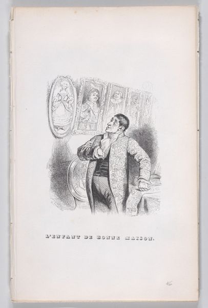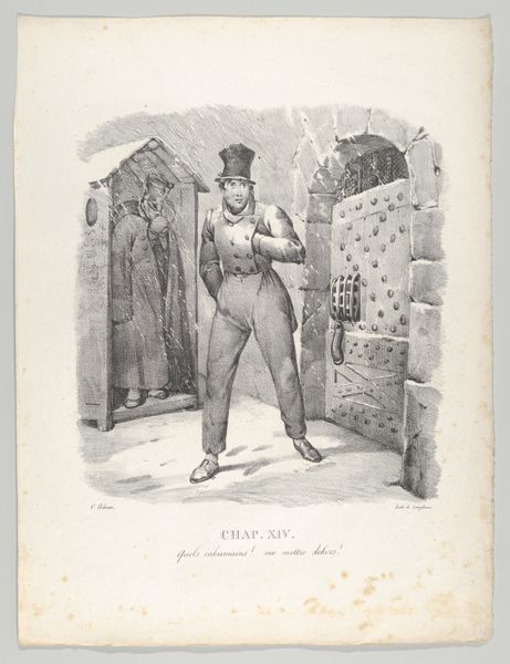 Curator: Welcome. We are standing before a lithograph dating back to 1836. It's entitled "The Wandering Jew" and originates from "The Complete Works of Béranger." The artist behind this piece is J.J. Grandville. Editor: Right away, there’s something hauntingly evocative in the figure’s determined stride, yet the face hints at immeasurable sorrow. It's as if time itself is etched into the deep lines around his eyes. Curator: Grandville’s illustrative choices here are fascinating. Note how the linear quality of the etching lends itself to both detail and symbolic weight. The character’s exaggerated features—his flowing beard, weathered clothing, the staff he leans upon—become signifiers in this narrative. Editor: Indeed, his clothes and bare feet seem to convey an alienation. He stands in stark contrast to the other villagers peering and pointing at him from a distance. This portrayal evokes feelings of rejection, displacement, perhaps even judgment from the other figures depicted. I can almost sense his perpetual solitude, despite being surrounded by others. Curator: Precisely, and this speaks volumes. Consider the visual rhetoric: the staff and the village are elements within Grandville's graphic vocabulary to connote weariness and a lack of rest. These are crucial to our understanding of this cultural icon. Editor: Is it the lighting trick, or is there is a dream-like unreality to the buildings behind? Something almost mirage-like that tells you he will never truly return home. And perhaps there is a parallel between his endless journey and humanity’s eternal quest for meaning? Curator: That is a pertinent reading given Grandville’s mastery of visual codes—elements which provide meaning well beyond the merely representational, tapping into historical memory and emotion. It reminds us that art objects aren't mirrors, but critical lenses that reveal the complexities of social life. Editor: Absolutely. Even after knowing it's an etching, it breathes with such a sorrowful, lonely air... Curator: The resonance between technical execution and emotive thematics is what allows a relatively small piece to reverberate far beyond its dimensions. Editor: Ultimately, it’s a testament to Grandville's vision that an image printed nearly two centuries ago can still provoke such poignant reflections today.