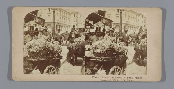 Curator: The image before us is a gelatin silver print titled "Gezicht op het Kerkplein in Pretoria met op de voorgrond Boeren met karren," which roughly translates to "View of Church Square in Pretoria with Boers and wagons in the foreground." It was created in 1901. My first impression is one of subdued energy – there’s a crowd, activity, but it's all rendered in this faded, almost dreamlike sepia tone. Editor: I'm immediately struck by the layering of symbols present here. Look at how the architectural language of the building behind them asserts power while the wagons themselves speak to movement, and labour. Consider the fraught context of the Second Boer War; This is clearly a statement about the social hierarchy. Curator: Precisely. The very act of documenting this scene normalizes the social dynamic that disenfranchised so many, which would have been an attempt by some photographers to assert and codify cultural norms. Editor: We also can’t ignore the use of the wagon—as it transports, facilitates expansion, often westward across lands occupied by indigenous populations. It also speaks to themes of identity, because the "Boers" present are descended from Dutch settlers with a distinct cultural identity shaped through colonialism, anti-British sentiment and conflict with native populations. The square as the central point is where they meet. Curator: It's easy to forget the inherent politics in photographs, particularly from this era. Think of what’s deliberately framed versus what’s excluded, because the visual choices actively endorse certain points of view regarding identity. Editor: And it brings up questions regarding power dynamics within South African society, as the building, and that society at the time was deeply fractured. Curator: A sobering yet important reflection for today. Considering not only the visual components but the politics that underpins everything being presented within the image itself, its place, its architecture and who populates them, and, perhaps more importantly, why. Editor: Absolutely. It invites us to think critically not only about who we are as South Africans but to ask questions as to how we interact with images, whose stories are validated or dismissed when such work are viewed uncritically.