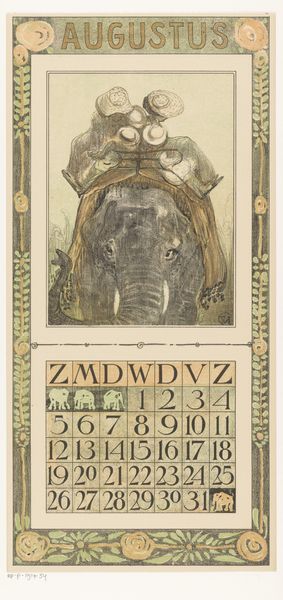 Curator: Looking at the 'Kalenderblad juli met apen' by Theo van Hoytema from 1905, what are your initial thoughts? It's currently held here at the Rijksmuseum. The work is a print featuring watercolor illustration in that distinct Art Nouveau style of the era. Editor: It feels...melancholy? Those monkeys have a human-like stillness, especially the one staring directly ahead. It's more than just illustration; there’s an unexpected depth there. It's interesting that the calendar grid feels secondary to this primate scene. Curator: Hoytema was quite the social critic. He produced these calendar sheets annually, often using animal imagery to critique societal norms. The choice of monkeys could represent the imitative, sometimes mindless aspects of human behavior he observed. Art Nouveau and Symbolism intertwine here. Editor: So, the monkeys aren't just being cute. They’re stand-ins, little reflections staring back at us. I wonder about his process. The texture gives it such an immediate feel; almost as though the monkeys emerged organically from the watercolor itself. And the muted greens… almost oppressive? Curator: Consider the institutional role of the calendar too. It’s a functional object, placed within the home. By using animal figures to critique bourgeois society, Hoytema inserted social commentary into everyday life, challenging conventions and sparking thought outside of a museum setting. Editor: Absolutely! A silent rebellion displayed month by month, almost like a visual manifesto quietly ticking on the wall. It challenges how people consider the natural world, morality and societal progress through subtle irony. Curator: Indeed, his artistic strategy gave this printed calendar power. It moved art into a conversational space, blurring boundaries. Editor: Well, this monkey business has given me a lot to ponder! Thanks for shedding light on Theo's layered narrative within something as simple as a calendar sheet. Curator: It's rewarding to bring new insights to pieces such as this, even after all these years. These calendar sheets demonstrate art's ability to penetrate beyond galleries, shaping viewpoints subtly, yet profoundly.