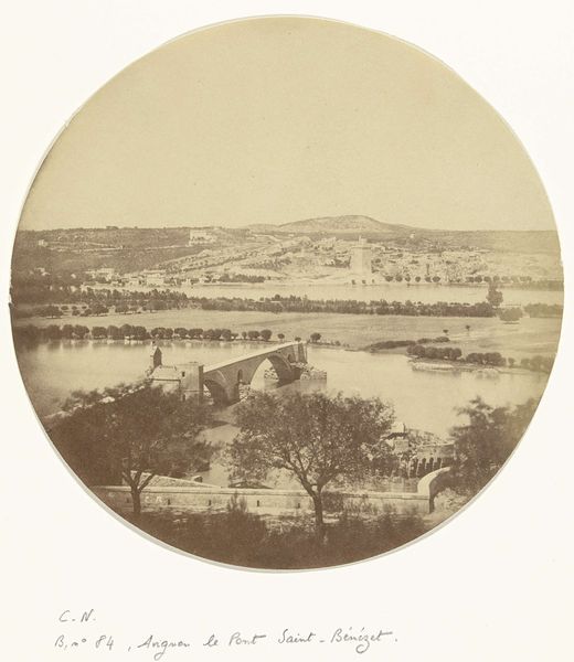 Curator: Let's discuss Charles Nègre’s "Asile impériale de Vincennes, vue de Charenton," taken between 1858 and 1859. What are your initial thoughts? Editor: There's a stillness that I find immediately striking. The muted tones, almost sepia-like, and the composition lead the eye to that distant cityscape framed within this almost perfectly round vignette. There’s a subtle melancholic beauty here, but a haunting feeling as well. Curator: Indeed. The formal composition of this daguerreotype is striking, but consider also the subject: an aerial view of the Vincennes asylum near Charenton. This was taken at a time when psychiatric institutions were undergoing significant reform, transitioning from places of confinement to potential centers for therapy. Nègre used photography, a new medium, to document these social shifts. Editor: You are correct. I agree it seems rather like a photographic survey, then. I keep returning to that perfectly round framing; it makes everything seem slightly staged. And then, to view what appears to be patients walking, as if on display. Curator: It is a calculated effect. Nègre worked with photography’s unique capability to capture detail but within very specific aesthetic frameworks of pictorial composition influenced by painting. Here the photographic process intersects with institutional intentions. This photographic gaze creates its own discourse around labor, reform and even the visibility, or lack thereof, of certain people and activities in society. Editor: Looking closely, you're right; the details, rendered with that daguerreotype clarity, really underscore that feeling. Despite its muted quality, the textures of the garden, the stone walls and cloudscape, all create depth that speaks to more than just aesthetic intentions. This also brings up a challenge of photography as artistic document in how one might perceive its intention versus its objective registration. Curator: Absolutely, a balance which Nègre constantly navigates, offering us glimpses of societal structures but also artistic vision in the mid-19th century. Thank you for unpacking it with me. Editor: Of course, what a fascinating convergence of formal artistry and documentary urge—I see new layers each time I view it.