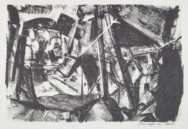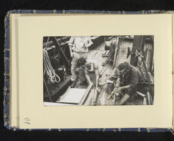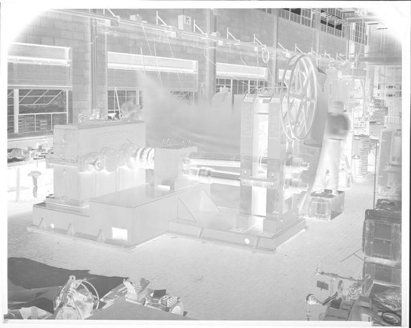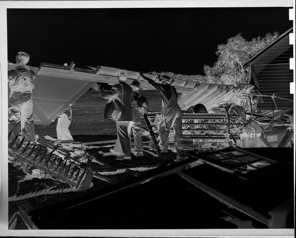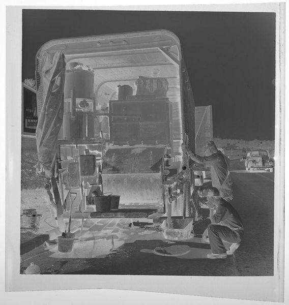 Curator: This gelatin silver print by Jack Gould shows men working on machinery. It’s titled "Untitled (men working on machinery digging into street)" and is part of the Harvard Art Museums collection. Editor: It’s so textural, even in reproduction! The negative space seems to amplify the gritty nature of the work being done. Curator: I see the theme of labor echoed in the composition. The machinery takes center stage, almost deifying the industrial process. Are these men contributing to something bigger than themselves? Editor: Absolutely. The arrangement around the machinery emphasizes its importance, overshadowing the individual laborers almost completely. It really asks us to consider where labor and industry meet, and what it costs. Curator: It certainly prompts reflection on the cultural narrative surrounding progress and construction. Thanks for this perspective. Editor: And thank you, It's interesting to consider industry and our cultural values connected to it.