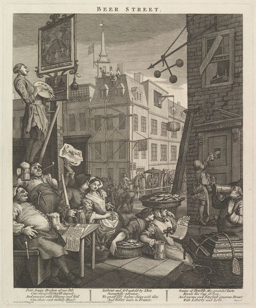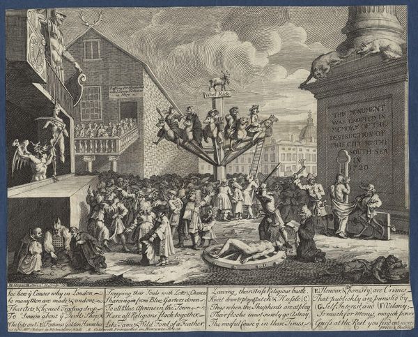 William Hogarth created "Burning the Rumps at Temple Bar" as an illustration to Samuel Butler's satirical poem, "Hudibras." The print captures a moment of intense political and social upheaval. It presents a scene of public outrage, reflecting the turbulent times of post-Restoration England. Here we see a carnivalesque atmosphere, where the "rump," or the remnants of the Parliament, are being symbolically burned. The crowd, armed with makeshift weapons, embody the popular discontent with the political elite. Hogarth doesn't shy away from portraying the chaotic energy of the masses. He illustrates the way in which collective anger and frustration are expressed through public spectacle and the destruction of symbols. The figures hanging in effigy point to the personal dimension of this political turmoil. The emotional undercurrent is palpable; it speaks of a society struggling to redefine itself in the aftermath of revolution and shifting power dynamics. The print is a reminder of how art captures, reflects, and shapes societal issues, offering a lens through which we can understand the complexities of identity and history.