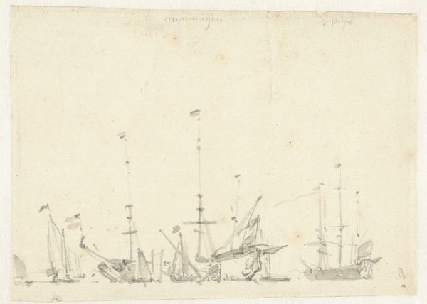 Editor: This is Willem van de Velde the Younger's "A Fleet," likely created between 1648 and 1707. It's an etching, with some pencil and print work it seems. There's a misty, almost dreamlike quality to the composition. The ships appear both grand and somewhat fragile. What socio-political narratives are being reflected? Curator: This piece is indeed evocative, and your reading hits the mark! But let's contextualize the dream-like state within a specific history: consider the role of the Dutch East India Company and the Dutch Republic’s dominance of maritime trade during van de Velde’s time. What stories do these ships, these instruments of trade and potential violence, tell about power and privilege? Editor: I see what you mean. The elegance of the drawing almost hides the more difficult aspects of that maritime power, the exploitation, the violence. How might class dynamics play a role here? Curator: Exactly! Van de Velde was the official marine draughtsman for the English crown later in his career, but these ships evoke Dutch maritime prowess. Consider who commissioned and consumed these images: wealthy merchants, aristocratic patrons, those invested in maintaining the status quo. Whose perspectives are absent from this seemingly serene scene? Editor: So, while the drawing is beautiful, we also need to think about what it leaves out. The voices of the colonized, the enslaved... Curator: Precisely! This fleet represents not just trade but also the projection of power and control across vast distances. By critically examining these absences, we can better understand the complex interplay of aesthetics, power, and historical context. It's a reminder that beauty doesn't exist in a vacuum; it’s intertwined with historical realities. Editor: That's really shifted my perspective. I see it now as a snapshot of a very specific, and morally ambiguous, moment in history. Curator: Art serves as a powerful conduit to our past, and as a tool for challenging its legacies in the present. The more we contextualize, the more the art begins to reveal!