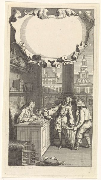 Curator: Editor: This is Bartolomeo Pinelli's etching, "Secretary of the Peasants in Rome." I'm struck by the contrast between the rough, almost caricatured figures and the formal, architectural backdrop. How do you see this interplay of class and setting in the materials used? Curator: As a print, this image was designed for mass production and distribution. The relatively inexpensive etching process allowed Pinelli to reach a wider audience, potentially democratizing access to art and commentary on social issues. The choice of materials and technique are key to understanding the artist’s intent to comment on labor, materiality, and consumption. Editor: That’s fascinating! So, the medium itself is part of the message, reflecting the accessibility he aimed for. Curator: Precisely. Consider how this contrasts with the labor-intensive methods of high art, like oil painting, often reserved for the elite. The material choices reveal a social critique. Editor: That makes me think differently about the whole piece. Thanks! Curator: It's crucial to examine the means of production to truly understand an artwork's significance.