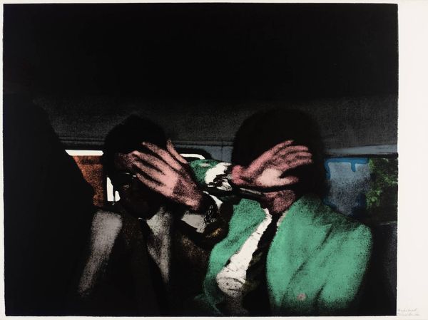Curator: Richard Hamilton’s "Stage Proof 17," from the Tate collection, presents a fascinating study of celebrity and the gaze. What strikes you about it? Editor: It feels so cool and detached, almost icy. The figures shielding their eyes create a barrier. I immediately think of paparazzi and the price of fame. Curator: Hamilton was deeply engaged with mass media and its impact on our perception of reality. He often used screen prints to explore these themes. There’s a starkness to the composition. Editor: Absolutely. The flattened planes of color and simplified forms add to that sense of distance. It's as if he's dissecting the image, pulling apart the layers of celebrity culture. Curator: He's playing with the idea of the image as commodity, something to be consumed and reproduced endlessly. It's a reflection on how we interact with images of public figures. Editor: It makes you wonder about the power dynamics at play here: Who is looking at whom, and what does it mean to look? The work definitely holds a critical lens to celebrity culture. Curator: Indeed, a provocative piece. Editor: An insightful look at how we consume images.