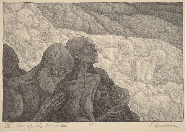 Curator: Alfredo Zalce created "Weaver of Becal Hats" in 1945, using a printmaking technique to render this striking scene. What are your first thoughts? Editor: There's an immediate sense of stillness, and yet the lines vibrate. It's monochromatic, nearly claustrophobic with the textures and limited light. Curator: Indeed. Zalce, associated with Mexican Muralism, often depicted everyday life with an eye to the indigenous experience. This print shows a man, seemingly inside a cave or dwelling, weaving one of the region's famous Becal hats. Consider the implications of situating this intimate act within a seemingly confined space. What power dynamics might this reference, both literally and metaphorically? Editor: The tight composition—the lines closing in around him—intensifies his focused concentration, his interiority. The stark contrast amplifies this—almost as though the man is the light. There is an interesting use of chiaroscuro. Curator: Exactly. There is this contrast between light and dark, and it plays with perceptions of space and depth while drawing us to his weaving process. Editor: Absolutely. But it also calls attention to his labor, literally highlighting his hands, showing each repetitive stitch. It's less about grand narratives here, perhaps, and more about a solitary man and his craft. I am noticing, how this weaving blends almost seamlessly with the rest of his being. What statements can you make about this? Curator: I agree, and one must also see that his figure's grounded connection to place reinforces his indigeneity and is critical given the history of land dispossession experienced by native populations, emphasizing their ongoing relationship with their heritage. Editor: Well observed. Curator: What resonates for you most about this piece? Editor: The pure mastery of form and light, particularly how that interplay elevates a simple subject. And you? Curator: The enduring dignity and resilience reflected in this depiction of everyday life within the context of historical struggles. Both aesthetic brilliance and a reminder of a difficult, yet steadfast legacy.