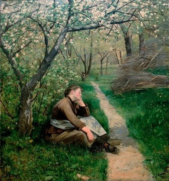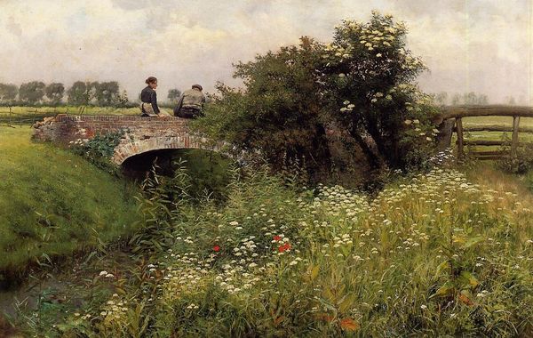 Curator: Welcome. Today, we’re looking at “Summer,” a painting by Albert Edelfelt. The scene evokes a quintessential sense of pastoral leisure. Editor: My first impression is of calm—a muted, tranquil scene. The figures are small and a bit blurred by the landscape, dominated by lush green hues. Curator: The texture of the canvas and Edelfelt's handling of paint, especially visible in the woman's dress and the dappled light through the leaves, are crucial to note. The brushstrokes themselves convey a sense of fleeting summer light. We see here an approach linked to plein-air painting, but one with specific social contexts of class and labor. Editor: Absolutely, we must consider that this idyllic vision omits the labor of maintaining these manicured lawns. While Edelfelt captures the appearance of leisure, the absence of working figures begs a conversation about the unseen labour inherent to sustaining the upper class’s recreational activities. Where are the gardeners, the domestic staff? Their absence speaks volumes. Curator: Indeed. The materials used—oil paint applied with varied impasto—were commercially produced, making art creation somewhat more accessible than in earlier periods. The very act of representing this particular class required labor, resources and infrastructure from outside this picture frame. How would that then impact the work's reception by varying audiences? Editor: Good question. The woman is deliberately removed from labor, visually set apart by her fine clothing and pensive gaze. This is a performance, but to what extent does the artist critique or uphold this social division? Edelfelt might be reflecting or even celebrating a moment in the sun before rapid urbanization alters Finland’s social fabric. Is the light that shimmers across the green fields a moment of quiet or of ignorance? Curator: Interesting question. Reflecting on the artwork’s positionality through social context deepens its appreciation beyond its pure aesthetic enjoyment. By carefully analysing materials, we illuminate its economic realities and wider production networks. Editor: Yes, exactly! The painting isn't just a window but also a mirror—reflecting both the values and the tensions of its era. Curator: Very true. This exploration only scratches the surface, but hopefully it underscores the layers embedded within. Editor: Agreed. Edelfelt’s "Summer" beckons to look more closely at the complex relations surrounding production and representation.