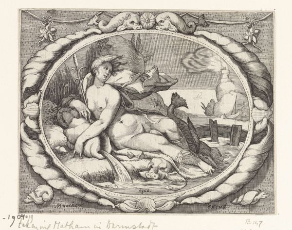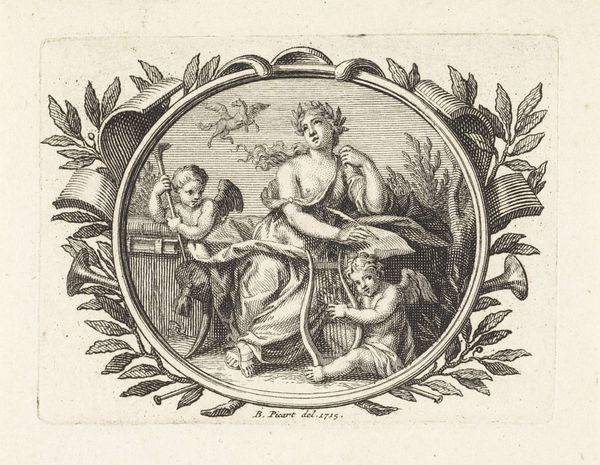 Editor: This is "Minerva as patron of education and the arts" by Simon Fokke, made sometime between 1722 and 1784. It's a print, a pen drawing really, full of such fine lines. The goddess Minerva sits in this ornate, oval frame... It feels like I'm peeking into a world of classical ideals. How do you interpret the imagery at play? Curator: Fokke presents Minerva, a potent figure. How does he mobilize symbols to transmit concepts of education and artistic ingenuity to viewers then, and even now? Let's explore the lasting emotional power of these symbolic components. Editor: The books and the beehive, of course, suggest knowledge and industriousness…and then there's the cherubic figure. Curator: Note how the books represent accumulated knowledge and learning, forming a literal foundation. Then, consider how the bees exemplify diligence and collaboration, mirroring the processes involved in art and scholarship. The cherub could point to inspiration, almost like a divine messenger that acts as an emblem of innocent curiosity, no? How would these emblems function together in the mind of an 18th-century viewer, do you suppose? Editor: That's interesting; so the cherub embodies a desire to learn, guiding people to knowledge? Curator: Exactly! This combination emphasizes Minerva's role not just as a guardian of established wisdom, but also as an advocate for the continuous pursuit and innovation of arts and knowledge. She almost guarantees a safe delivery of tradition to a new future. And the inclusion of that spear... does that skew your first, gentle impression any? Editor: It does! Almost makes the scene a little…combative? I mean, the pursuit of knowledge isn't always peaceful, I guess. Curator: Yes, knowledge is defended and applied. Together, these elements portray her influence over creativity and the expansion of intellect through constant engagement and dedication. Editor: That really does pull the whole picture together. It's so much more than just a pretty picture; it's a statement. Curator: A statement delivered through a common language of symbols, a shared cultural memory we can still decipher centuries later.