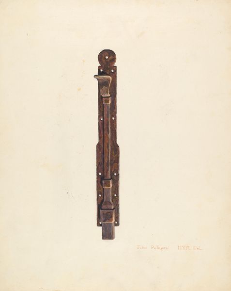 Editor: This is Hardin Walsh’s "Bishop Hill: Fire Extinguisher," a watercolor and drawing from around 1938. It has a stark, documentary feel; like an artifact meticulously recorded. What do you see in this piece? Curator: The object itself, rendered so plainly, is a fascinating signifier. Consider its era; 1938, just before the conflagration of the Second World War. An extinguisher, a preventative measure. Editor: So, you’re saying that the extinguisher can symbolize this anxiety about something potentially dangerous. Curator: Precisely. Also, think about Bishop Hill, Illinois, itself; a utopian religious community founded by Swedish immigrants in the 1840s. It eventually dissolved, burdened by internal conflict. An extinguisher wasn't enough. Perhaps Walsh implies a lost idealism. Editor: The more that you analyze it from the cultural context, the more that I can see it in the extinguisher, like a memory preserved. Curator: The image isn't simply of the object itself, but is, in some ways, representative of this anxiety. Can we prevent catastrophe? Is harmony even achievable? Editor: Thinking about it that way gives so much more meaning. It's amazing how much cultural context is stored in this. I won't see such items the same way again. Curator: Every image whispers its secrets if you listen closely. Thanks for walking with me to discover them.