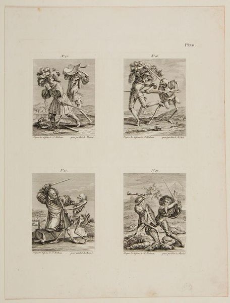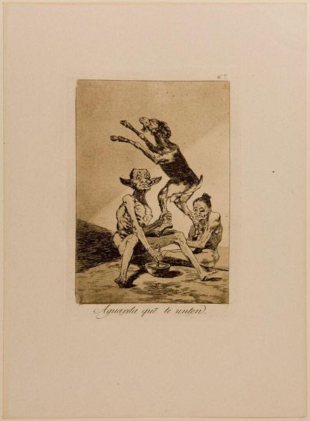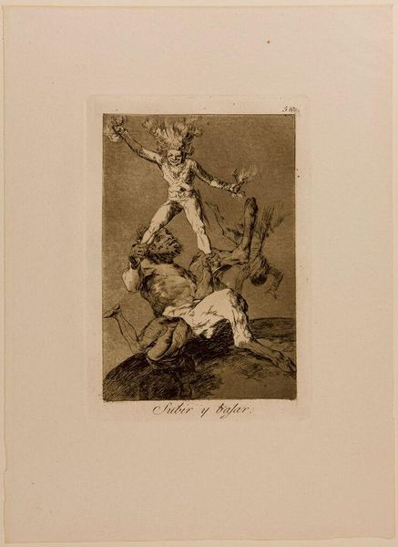 Editor: This is "Devout Profession" by Francisco José de Goya y Lucientes. It's a disturbing image, with figures piled on top of one another and ghoulish characters in the background. What can you tell me about this work? Curator: Goya often critiqued social and political institutions, especially the Church. This piece likely comments on the hypocrisy and corruption Goya saw within religious practices of his time. Notice the distorted figures – how do they represent power dynamics? Editor: They seem to be exploiting those beneath them to gain access to the religious figures in the background. It is quite a scathing critique. Curator: Precisely. Goya used his art as social commentary, influencing public opinion through powerful imagery. It highlights the potential for art to engage in political discourse. Editor: I never considered the public role of art this way. Thanks!