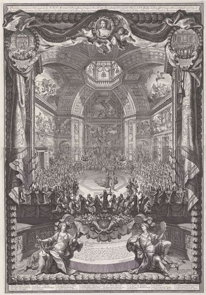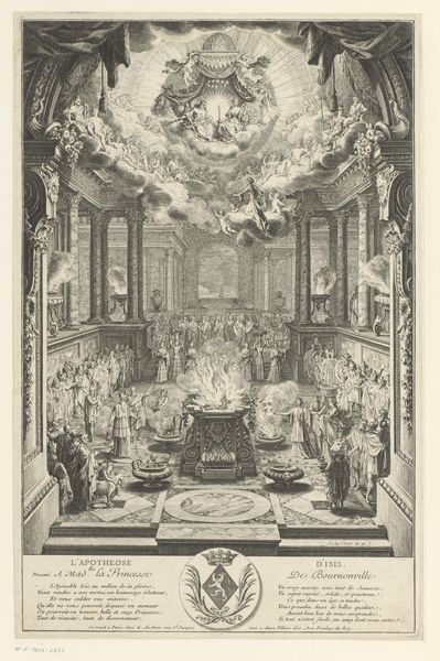 Curator: Oh, the weight of history! Just look at this scene. We're looking at an engraving titled "Katafalk i Christiansborgs Slotskirke ved Frederik V's død," or, the Catafalque in Christiansborg Palace Chapel at the Death of Frederik V. It's dated 1768. The artist is Johannes Gottfred Bradt. Editor: Whoa, heavy vibes. The scale is immense, almost dizzying, like the room stretches forever upward, right into the swirling heavens. All in somber greyscale. Makes you feel a bit like an ant at a giant's funeral. Curator: Precisely. Bradt really captures the grandeur, but also the somber mood of the royal court in mourning. You can see the entire chapel transformed for the king’s funeral. Catafalques, these elaborate, often temporary structures, were common displays during the funerals of prominent people during the baroque era. The artist’s portrayal is not just descriptive but evocative. Editor: And what's up with that giant pyramid in the center? I mean, it's certainly imposing, and seems like the absolute focal point, but feels...unexpected? Curator: It's fascinating, isn't it? The pyramid, likely draped in fabric, is adorned with symbolism – the crowned 'F' probably referring to Frederik. It points heavenward. Funerals, particularly royal ones, were huge public statements. They were carefully orchestrated events, loaded with imagery, meant to reinforce power structures and ensure dynastic continuity even in death. They affirmed the monarchy's divine right. Editor: It almost feels staged. Like, the people milling about seem posed, consciously aware of being part of the spectacle. There is little genuine emotion captured. More theater than tears. It is like being in a painting inside a painting. Curator: Absolutely. That's a key insight. Remember, this is an engraving intended for distribution, a visual record crafted to communicate specific messages. Editor: It is like early photoshop – or Instagram. Crafting the correct image for the consumers and supporters. Even now the work emits this feeling of importance of its creation. Curator: True – although, for those that could read at the time, inscriptions at the bottom give greater and additional details. Engravings such as these, had several purposes. They made for relatively inexpensive reproductions and distributions of current or historical events, acting like pictorial newspaper representations that might capture certain historical events. Editor: Makes you wonder how accurate this depiction of this must have actually been. A royal funeral, then and now, must have involved intricate planning and symbolism that is interesting to explore. Thanks for bringing me to this piece. Curator: Indeed, these kind of prints act as interesting documents which are a fusion between reality, documentation and spectacle for its consumers. It is quite a rich space for scholars and art lovers alike.