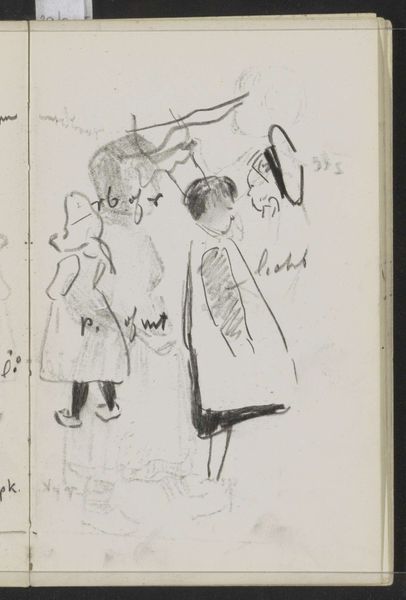 Editor: This is "Study Sheet with a Hussar, a Saddle and Men's Heads" by George Hendrik Breitner, drawn between 1880 and 1882. It's a pencil drawing. There's a hushed, almost secretive feel to it, a sketch capturing fleeting glimpses of figures. What do you see in this piece, beyond the surface-level depiction of a soldier and some heads? Curator: I see echoes of cultural memory embedded within these rapidly sketched lines. The hussar, a figure associated with bravery and even recklessness, reminds us of Romantic notions of heroism and national identity in the late 19th century. But here, he is deconstructed, fragmented – is Breitner subtly questioning those very ideals? Look at the almost phrenological emphasis on the men's heads. What does the artist say here about observation versus categorization? Editor: So you're suggesting the quick nature of the drawing and the focus on isolated elements invite us to reconsider the grand narratives we often associate with these figures? Curator: Precisely. And note the saddle, isolated, almost disembodied. The hussar is rendered incomplete without his steed. Think of how a horse is historically loaded with symbolism of power and strength. Here, the power is somehow… absent, only loosely referenced. It reminds us that symbols can be both potent and ultimately fragile. Perhaps we can question our immediate impressions of status, strength, or class through their symbolism. What stories might a future audience tell from the image of this saddle, without the hussar to claim it? Editor: That’s a really interesting point. I hadn't considered how much the incompleteness of the images challenges traditional readings of these symbols. Curator: Art helps us recognize how deeply symbols permeate and shape our understanding of self and the world, in Breitner’s time, as well as today. What a wonderful peek into cultural memory that we have at the Rijksmuseum. Editor: It really changes my perspective, thinking about it as a reflection on cultural symbols. Thanks for your insight!