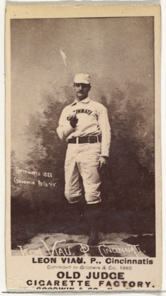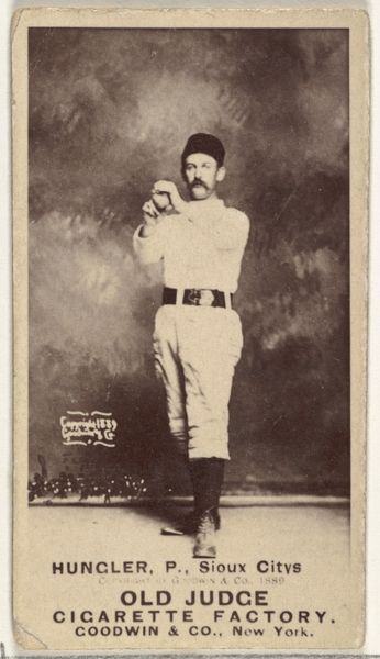 Curator: Before us is an albumen print from 1888, titled "Johnston, Center Field, Boston, from the Old Judge series" by Goodwin & Company. It depicts a baseball player in full uniform. Editor: The sepia tone lends a nostalgic air. I'm immediately drawn to the figure’s pose – casual yet poised, the small dark ball in his hand a focal point against the lighter background. Curator: Exactly. It's one in a series of baseball cards printed by Goodwin & Company to be included in packs of Old Judge Cigarettes. These cards served not only as collectibles but as advertisements for the tobacco company, inserting images of sport into the landscape of American consumer culture. Editor: So, considering its dimensions as a cigarette card, the visual organization is quite striking. The tight framing focuses our attention on the figure, while the subtle variations in tone and texture across the background and uniform are finely rendered. Notice how the textures—the fabric of his uniform, the leather of the baseball—are all distinct, delineated only through light. Curator: These baseball cards weren't simply printed; albumen prints were created using a process that involved coating paper with egg white, which made for a smooth surface upon which a photographic image could be printed. The production process, the printing and distribution methods, and the commercial imperative – these aspects significantly inform our understanding of the image itself. Editor: I see that, yet I find that attention to process almost distracts from the core compositional elements: the way the body occupies the space, the gentle curve of the arm holding the ball mirroring the subtle bend in the player's stance... These visual rhymes create a harmonious, almost classical effect. Curator: And the photograph, functioning as advertisement, taps into contemporary trends of commercial image consumption in America. Images that were never designed for high art consumption but nevertheless illuminate society, culture, labor... Editor: All crucial layers, and a vital example of how formal properties—the interplay of line, form, and light—can create meaning. Ultimately, both are fused. Curator: Agreed. This work presents an excellent example of the commercial influences on art at the time. Editor: Indeed. A poignant capsule of form and time, perfectly captured.