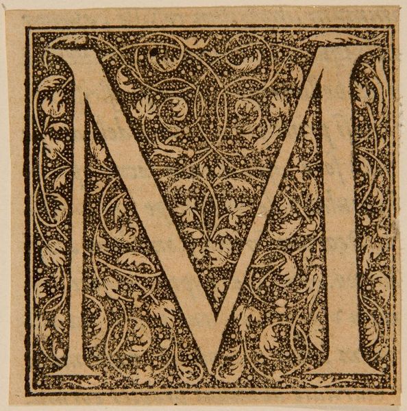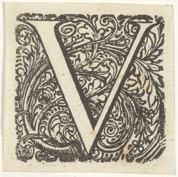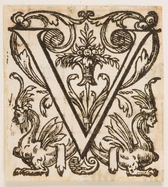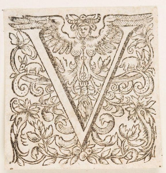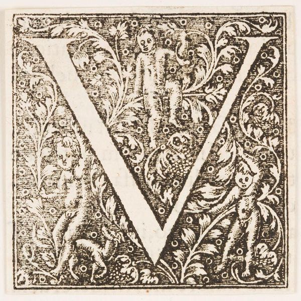 Curator: Here we have "Letter V," by an anonymous artist, residing in the Harvard Art Museums. Editor: My first thought? A woodland dream! That owl perched so innocently within the letter feels both wise and a little mischievous. Curator: Indeed. The black and white contrast in the woodcut enhances the ornate details, creating an intriguing figure-ground relationship. Editor: And it’s not just the owl; look at the swirling leaves and those creatures lurking among the vines. It's as if the letter itself has sprouted a tiny ecosystem. Curator: One might interpret this as indicative of the life that language itself breathes into the world. Each letter a vessel for stories and meanings. Editor: Perhaps. Or maybe it's just a beautifully crafted letter V with a touch of whimsical forest magic. It makes me want to write a fairytale. Curator: A fitting response, given the artwork's evocative nature. Editor: Absolutely. It makes you wonder about the stories this letter might have begun.
