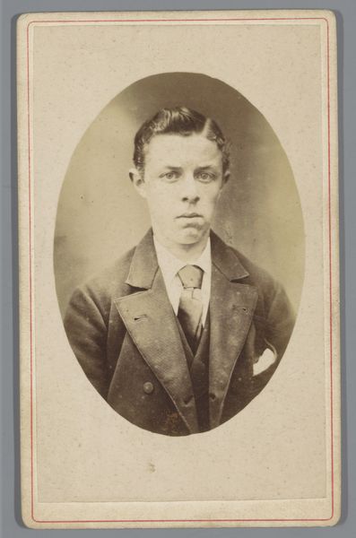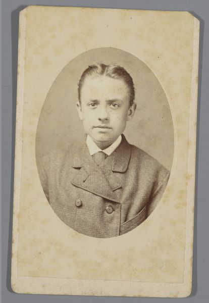Curator: Let's discuss this photograph entitled "Portret van een onbekende man," dating approximately from 1890 to 1910. It’s an albumen print portrait by Hk. Faber. Editor: My immediate impression is the formality, yet there’s a quiet stillness to his gaze. The oval frame intensifies the focus, pushing everything toward this unknown individual’s face. Curator: Indeed, the oval shape acts as a pictorial frame reinforcing classical portrait conventions. The photographer’s careful composition guides us toward a very specific reading of social class through details like the crisp lines of the man’s dark suit and tie, the double-breasted jacket. Editor: I find it fascinating how much the material tells us. Albumen prints, using egg whites, would’ve created this almost ethereal sheen. Think of the labor—collecting, processing eggs—before the picture even begins! These small format prints were immensely popular. So affordable images meant expanding markets. Curator: Absolutely, it highlights how advancements in the science of photography were evolving the possibilities for image construction and dissemination. We also need to consider how the conventions of formal portraiture here play out given photography’s indexical relationship to reality, meaning that every visible detail counts, as it stands in direct physical contact with what’s being recorded. Editor: I’m particularly drawn to the visible wear on the physical print; a tear along his jacket… it’s proof that the image was cherished, a hand-held object passed between viewers. To consider the emulsion itself, a thin skin derived from animal components... Curator: The semiotic implications, however, go beyond the tangible nature. He presents an example of late 19th-century masculinity. The rigid posture and stern expression, while now seeming antique, were social requirements—essential signifiers within that era’s social construct. Editor: A visual token, representative of how we choose to document memory and our social relations—and simultaneously, an economic artifact indicative of technological accessibility for the rising middle class. Curator: So we have this image serving simultaneously as a representational exercise and as an embodiment of a certain time period through materiality and subjecthood. Editor: Exactly. This small, faded print encapsulates a far broader network of economic systems, labor, and, crucially, how images like this democratized image-making for a broader spectrum of society.