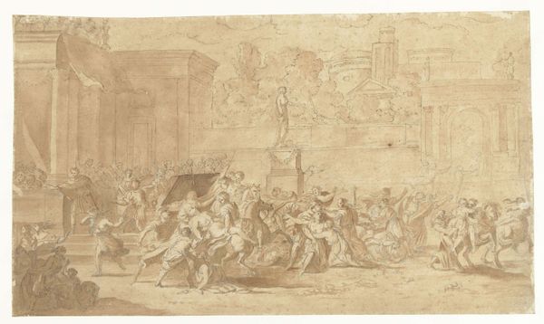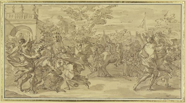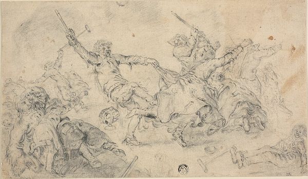 Luca Giordano rendered this drawing of 'The Triumph of Cybele' using pen and brown wash over black chalk. Giordano, a dynamic figure in the late Baroque period, was deeply influenced by the theatricality and grandeur of his time. His work reflects the prevailing societal norms that celebrated power and divinity through allegorical representations. Here, Cybele, the Phrygian earth goddess, is depicted in triumphant procession, surrounded by a retinue of figures amidst swirling clouds, evoking a sense of awe and reverence. It's important to remember that in the 17th century, representations of female figures often served to reinforce societal expectations of women as symbols of fertility and abundance. However, the dynamic composition and energetic execution of the drawing also suggests a subversion of traditional representations, conveying a sense of power and agency. Giordano uses dynamic composition to invite us to contemplate the intersections of identity, power, and representation within the socio-cultural landscape of his time.