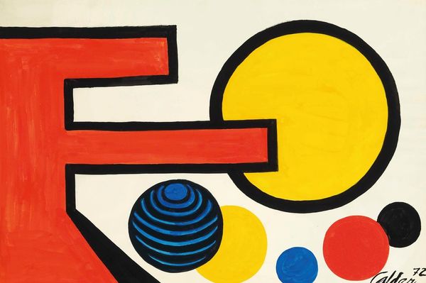 Editor: Here we have Alexander Calder’s "Happy," a vibrant acrylic painting from 1974. I’m really drawn to the playful geometric shapes and the bold color palette. What strikes you most about the composition? Curator: Indeed, the painting's strength resides within its formal organization. The interplay of primary colors—red, yellow, and blue—establishes a visual rhythm, a dialogue if you will. Observe how the shapes, though seemingly disparate, are unified by the black outlines, creating a cohesive whole. It demonstrates an advanced understanding of pictorial space and the potential for creating dynamism through strictly formal means. Editor: So, you are less concerned about the potential symbolism of, say, the circular shapes versus the more angular ones? Curator: The intrinsic visual properties hold precedent here. Note the tension between the flatness of the painted surface and the illusion of depth created by the spirals. Are they pulling us in, or pushing us away? These optical mechanics underscore Calder’s mastery. His approach transcends the need for referentiality; instead, it hinges on the immediate and purely optical engagement with the viewer. Editor: I see. It's less about what the shapes *mean* and more about what they *do* to the eye. That’s a useful distinction. I am starting to see this work from an exciting, different perspective. Curator: Precisely. Art at its best should prompt new perceptual relationships for us, which “Happy” certainly seems to achieve. Editor: I’ve certainly gained a much more precise vocabulary for decoding abstract works like this one, considering shape and color first. Thanks for your insights.