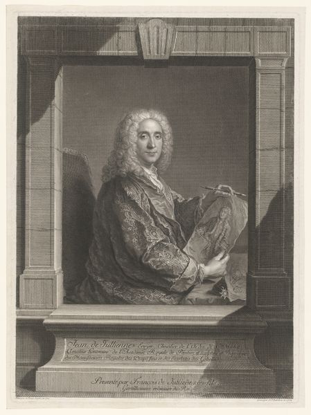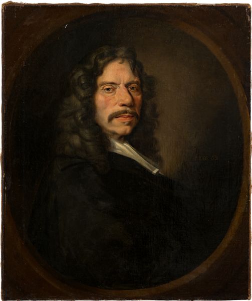 Editor: Here we have "Portrait of a Man (Rudolf van Loen_)," crafted around 1700 by Arnold Houbraken. It's an oil painting, and the subject's confident gaze is striking, isn't it? I'm curious, what grabs your attention when you look at this piece? Curator: It's the sheer drama of it all! The flamboyant wig, the opulent robe—it’s Baroque excess at its finest, screaming "Look at me!" Houbraken seems to be asking us to consider how appearances can communicate so much about a person’s status and character. Do you get the sense that he’s almost performing for us, striking a pose? Editor: Absolutely, there's definitely a theatrical quality. The rich, golden robe almost feels like a stage costume. Curator: Exactly! And those hands—one offering, one clutching. They almost tell two different stories, don't they? This, for me, transcends a simple likeness; it is more a constructed ideal of male importance. A symbol, if you will. Editor: I see what you mean about the hands, such different gestures! Do you think Houbraken was making a statement about the superficiality of wealth, or was it simply a reflection of the times? Curator: Possibly both! Good art holds up a mirror, even if slightly distorted. I bet you, Mr. Van Loen _ wanted to be seen in precisely this way. The artist's hand becomes secondary to the story we all conspire to believe about him. Isn’t it fascinating how much narrative a portrait can hold? Editor: It truly is. I never thought about it that way – a story we conspire to believe. Thanks for pointing that out. Curator: My pleasure! It's these kinds of dialogues that allow the art to transcend the mere act of looking.