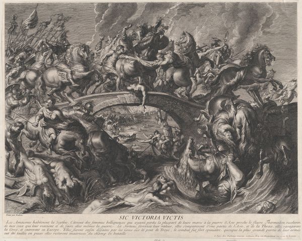 Editor: So, this is Pieter van der Heyden’s 1556 engraving, "The Temptation of St. Anthony." It’s teeming with bizarre creatures and unsettling scenes; honestly, it feels like a Hieronymus Bosch nightmare made miniature. What exactly am I looking at here? Curator: This print demonstrates how images actively participated in shaping religious and social norms of the 16th century. Considering its moment of production—the Reformation—can you see how such fantastical imagery could reflect anxieties surrounding religious upheaval and social instability? Editor: I can see that; St. Anthony’s ordeal with demons was certainly a popular subject. What does this tell us about how religious subjects were viewed, and about the artist’s possible views on the changing world? Curator: Precisely. The scale is small, and was easily circulated. Notice how van der Heyden adopted Bosch’s imagery of monstrous figures and chaotic scenes, making the saint’s suffering strikingly vivid. Why do you think images of saints in duress became such powerful visual narratives? Editor: I guess they were meant to show the strength of faith, even in the face of the unimaginable. They serve as reminders of morality amidst chaotic and ambiguous imagery, and warnings. I wonder how viewers at the time actually received this, given the societal disruptions. Curator: It would definitely provoke a mix of fear, awe, and perhaps even a sense of morbid fascination. Prints like this circulated widely, influencing the ways people understood not only religious narratives but the socio-political forces shaping their lives. In fact, the politics of imagery played a major role. Editor: It's interesting how art can reflect both personal anxieties and larger cultural shifts, especially through printmaking. Curator: Exactly, a great way to describe how history informs how we view a work.