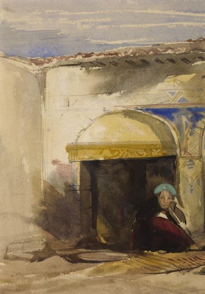 Curator: Well, let's spend some time with Martiros Sarian's "Evening in the Garden," painted in 1903 using oil on canvas. Editor: It feels hushed. That heavy darkness around the tree contrasting with the pale gold of the building...makes it seem like the end of a long, sweltering day. Curator: Absolutely. The figures are key to that atmosphere. Their positioning hints at established social dynamics, perhaps even a religious hierarchy made more apparent by the garments. Editor: The cloaks are fascinating. It's like the fabric has a voice, murmuring stories of journeys taken, beliefs upheld, secrets whispered under starry skies. Curator: Symbolically, darkness represents the unknown. That large mass surrounding the figure at right seems almost protective. Editor: I feel a little lost in it. But there's a sense of refuge as well; a return home to a space weathered and familiar. Do you feel that in the impasto? Curator: Certainly. Notice how the artist builds up texture using that heavy paint, capturing how sunlight can almost appear solid at certain times of day. This can connect to our spiritual interpretations of warmth. The expressionist nature of Sarian invites us to participate in building meaning. Editor: That's where I find joy, really--those unexpected strokes giving something new, a shadow, and an element of emotion each time I encounter it. Curator: His landscapes almost pulse with an inner light; there's a deliberate crudeness that contributes to this, an expressionist urge toward authenticity. It transcends mere observation. Editor: Indeed! I initially responded to that darkness, but this close analysis unlocks the underlying emotional complexity of Sarian's impression. Curator: And that tension, that juxtaposition of light and dark, of crudeness and sophistication is precisely what elevates "Evening in the Garden" to such an interesting artwork. Editor: Agreed. Thanks to that dance, I don't just see an evening; I experience its profoundness.