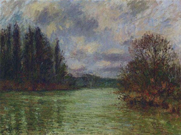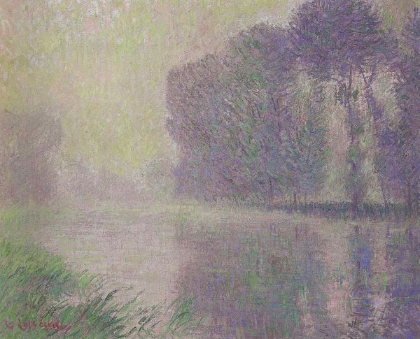Editor: So, this is Gustave Loiseau's "By the Eure River, Mist Effect," painted in 1905. It’s an oil painting that really captures this almost dreamlike landscape. What do you see in this piece, considering the time it was created? Curator: The dreamlike quality is precisely where the painting speaks to a broader historical context. At the turn of the century, industrialization was rapidly transforming landscapes and disrupting traditional ways of life. Impressionism, in its focus on fleeting moments and subjective experiences, can be seen as a response—even a resistance—to this encroaching modernity. How does the "mist effect" play into that for you? Editor: I guess the mist blurs the sharp edges, almost obscuring any sign of the modern world. It’s like nature is reclaiming the space, or at least hiding it. Curator: Exactly. Consider too the “plein-air” technique – painting outdoors. It suggests a desire to reconnect with the land, to observe and preserve what's being lost. And within Impressionism, think about whose perspectives were prioritized. Did it offer space for women artists, for working-class narratives, or did it remain largely a bourgeois project? Editor: That's something I hadn't really considered – the social and political implications of landscape painting itself. It makes you wonder whose stories are being told, and whose are being left out of the frame. Curator: And it pushes us to question how we consume these images today. Are we simply appreciating a pretty picture, or are we engaging with the deeper anxieties and tensions of its time, and potentially, even reflecting our contemporary moment? Editor: I think I'll definitely look at Impressionism differently now. It’s more than just pretty colors; it's a conversation about change, loss, and representation. Curator: Precisely! And art should prompt conversations; make us think about those things we might have previously been unaware of or hesitant to broach.