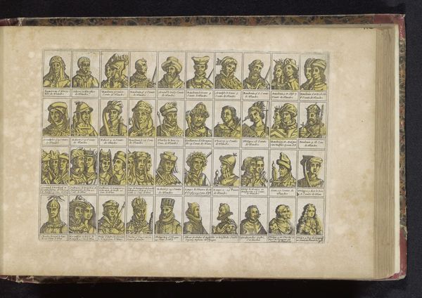 This undated work by an anonymous artist presents a grid of portraits, each meticulously crafted with pen and ink. The composition arranges numerous small, framed portraits in a rigid, orderly fashion, suggesting an attempt to classify and present a comprehensive historical lineage. The use of line is precise, delineating the contours of faces, hats, and clothing with clarity, while the limited use of yellow wash adds depth and form. The structure here speaks to a desire to categorize and contain historical figures within a defined system. Each portrait shares a similar structure. The individual components, such as the variation in the attire, serve as signifiers, communicating social status and historical context. Yet, the grid format imposes a certain uniformity. In doing so, it subtly challenges notions of individual exceptionalism within historical narratives. Consider how this formal arrangement shapes our understanding of power and representation. Art invites us to continuously question and reinterpret its significance across time.