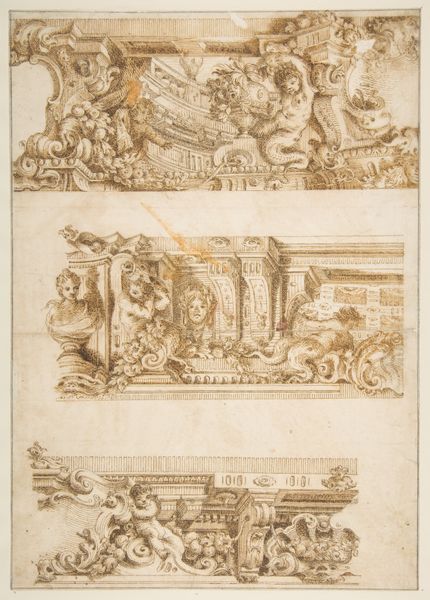 Curator: This pen and ink drawing is entitled “The Prodigal Son,” etched by Daniel Lindtmayer sometime between 1552 and 1607. It is currently held at the Metropolitan Museum of Art. Editor: What strikes me immediately is the overwhelming level of detail, almost claustrophobic. The artist has chosen to dissect and display the narrative through segmented vignettes. Curator: Precisely. Notice how Lindtmayer divides the paper into distinct registers, each dedicated to a phase in the biblical parable. It is essentially a structural analysis of the story. The composition avoids a conventional, linear narrative; instead, it opts for a fragmented, almost cyclical representation. Editor: Absolutely. And within those segments, the iconography is rich. Consider the scene of the prodigal son among the swine. Pigs, historically symbols of greed and impurity, underscore the son's degradation. Then we have, higher in the register, his departure with his inheritance juxtaposed against musical revelry—a visual encoding of excess. Curator: A crucial formal element, I believe, is the density of line work. Lindtmayer's mastery of the pen is evident in his creation of texture and volume, the intricate shading of faces to architectural features. It demonstrates sophisticated control over value. Editor: But look closer at the archways. There are more subtle allusions to familial strife throughout. This isn’t simply the story of repentance, but perhaps also resentment. Consider, too, the symbolic importance of the father’s costume as a visual signifier of patriarchy in Early Modern Europe. Curator: It seems he is definitely embedding social commentary as well. Editor: It’s interesting how the rigid borders contrast with the rather emotionally volatile content; one expects to see some kind of spillover in an artwork depicting the prodigal son. This all leads one to believe there could be a moral imperative encoded here. Curator: Lindtmayer's piece, from a purely structural perspective, is a complex dance between form and content, showcasing his ability to distill the parable into digestible visual components. Editor: A very neat, economical synthesis of symbol, form and historical moment indeed.