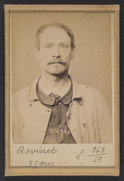 Curator: This is a daguerreotype by Alphonse Bertillon, titled "Foussard. Eugène. 26 ans, né le 7/12/67 à Dangeul (Sarthe). Peintre en bâtiment. Anarchiste. 2/7/94," made in 1894. Editor: The first thing that strikes me is the gaze, so direct. Almost unsettlingly present despite being over a century old. Curator: Indeed. Bertillon, as a police official, pioneered this style of photographic documentation for criminal identification. This image is, in essence, a mugshot. Editor: Which frames it very differently. I’d assumed a portrait of someone wanting to record their likeness. Now I'm thinking about the labor of building and anarchism at the turn of the century. Eugène—the name rolls off the tongue—is no passive subject. You can see it in the set of his jaw, the lines etched into his face, a life carved from toil. I wonder about the paint he applied. Was it meticulously crafted, or functional, meant to last for generations? Curator: We know he was an anarchist, which places his labour within a network of mutual aid and resistance to centralised systems. The materiality of building, like the materials of Bertillon's own system of documentation, became tools, potential weapons. Editor: Look at the textures in this image itself. The slight blurriness softens him and yet it gives him a certain aura too. Think of all the hands that made that daguerreotype plate and mixed those chemicals. This object isn't just evidence. It’s heavy with intent, fear, and perhaps, defiance. Curator: A photographic object born out of—and feeding back into—a system of social control. Photography's relationship to realism here reveals more about its constructedness. It shows an industrial world in motion with a portrait imbued with all the human tensions contained. Editor: A powerful thing, isn’t it? To look at a single, simple photograph, and see within it an entire world teetering on change. Curator: It speaks of the powerful potential residing even in what seems like a single frame.