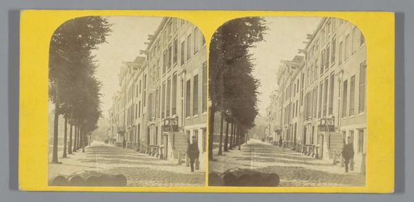 Curator: Pieter Oosterhuis’s photograph, "View of the Keizersgracht near the Oude Leidsestraat in Amsterdam", created sometime between 1860 and 1885… it's a gelatin-silver print currently residing here at the Rijksmuseum. What strikes you most when you see it? Editor: Initially, the stillness. It feels profoundly quiet, despite being a cityscape. The sepia tones add a sense of remove, like looking at a memory, or even a stage set where nothing much ever happened, and now never will. It invites me to reflect on absence more than presence. Curator: Precisely. Oosterhuis was working during a period of immense social change in Amsterdam. Photography offered a new way to document the city's evolving face. He wasn't just capturing buildings, but also a specific moment in the urban experience— a moment poised between tradition and modernity. Editor: So, do you think his framing of that tree as central—the somewhat stark absence of foot traffic or streetcars—points towards a specific socio-political idea? Is this more commentary, less documentary? Or am I making assumptions? Curator: The near absence of people certainly directs our gaze differently. What you see may be due less to direct intervention by the artist, and more the result of very long exposure times during the early decades of photography: Moving objects are nearly impossible to capture. The emptiness amplifies the rigid architecture, the quiet resilience of the buildings, each standing shoulder-to-shoulder. Also consider the growth of tourism during that period; images like this romanticized and, in a way, packaged the city for outside consumption. Editor: Packaged—interesting. It still whispers to me, though, about change. All those brick buildings standing stoically as empires shift—or perhaps crumble slowly, over time, unseen except as an accumulation of shadows. Even now. There is some permanence there that still evokes something strong. Curator: Oosterhuis was attuned to capturing not just the structure of Amsterdam, but its enduring soul, too. The photograph embodies a quiet testament to the passage of time, its impact upon place and perception. I hope you have enjoyed our time contemplating it. Editor: Absolutely. Thanks for illuminating some beautiful corners and offering insights, that really changed how I look at it, even now!