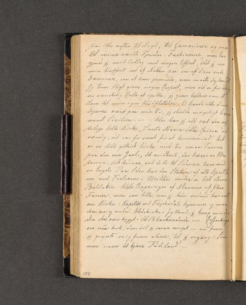 Editor: We're looking at "Rejsedagbog," or "Travel Journal," created in 1846 by Johan Thomas Lundbye. It seems to be a personal sketchbook of sorts. The aged paper and the artist’s handwriting give it a very intimate feeling. How do you interpret this work? Curator: What strikes me immediately is how this everyday object—a travel journal—becomes a repository of cultural memory. Lundbye isn't just recording what he sees; he's imbuing these places with his own experience, layered upon layers of history and artistic tradition. Do you see how the handwritten notes, almost like runes, create a sense of personal narrative interwoven with larger cultural narratives? Editor: I see that. The text almost becomes an image in itself. Are there particular symbols or visual cues that stand out to you? Curator: Absolutely. The very act of journaling, of recording one's travels, is symbolic. It suggests a desire to connect with the world, to document it, and perhaps even to claim ownership of it through representation. Also, consider the materiality of the book itself: paper has its own history and evokes personal associations as a vehicle for thoughts and record keeping. Editor: It's fascinating to think about how an object as simple as a journal can hold so much cultural weight. Curator: Exactly. And Lundbye, as an artist, is acutely aware of this. He uses the journal to inscribe his own experiences, linking them to the landscapes he observes. So, the journal is more than a record—it is a cultural artifact, rich in symbolic value. Editor: I hadn't thought about it that way, it really makes you see it in a different light! Curator: I agree, it’s often the most common objects that possess the deepest layers of significance.