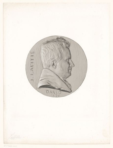 Editor: Here we have "Medaille met portret van Élise Voïart", a print made after 1832 by Achille Collas in the neoclassical style. It's a relief print, giving the piece a tactile quality, almost like a coin or a cameo. It's really quite understated and elegant... What are your thoughts on it? Curator: Elegant is a perfect word, isn't it? Like a whisper of history. The piece breathes Neoclassicism; that reverence for antiquity, the crisp lines, and that sense of idealized form. It's as if Collas wasn't just creating a portrait but enshrining Élise Voïart in a classical pantheon. The medium of printmaking allowed for wider circulation of such idealized images, influencing notions of beauty and status. Do you notice how the gaze avoids direct contact, creating an aura of sophisticated detachment? Editor: Yes, it does lend a sort of cool distance. Do you think it's meant to project a specific idea of femininity? Curator: Absolutely! The tightly controlled hairstyle, the high-necked garment, the profile pose itself – they all contribute to a carefully constructed image of bourgeois virtue and intellect. It's about presenting a woman as both respectable and refined, qualities highly valued in that era. I find myself wondering about the relationship between artist and sitter. Did she commission this piece? Or was it an act of admiration? It whispers a whole narrative! Editor: It really does! It’s interesting how much information you can extract from a seemingly simple portrait. I definitely see it with fresh eyes. Thanks for illuminating it for me. Curator: The pleasure is all mine. Sometimes the quietest art speaks the loudest.
