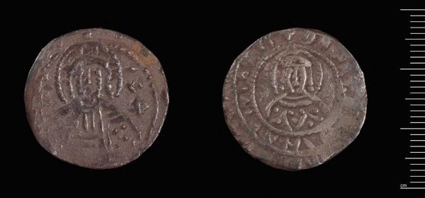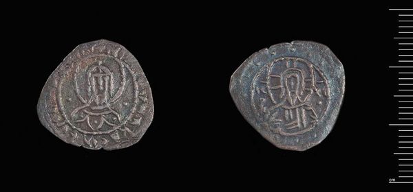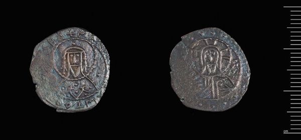 Editor: This is a Half-Stavraton of Manuel II. It's a very small coin! What strikes me most is how these figures have been worn down over time, yet they retain some legibility. What significance do you see in these worn symbols? Curator: The wear itself is significant, isn't it? It speaks to the coin's journey through time, its circulation through hands and markets. The imagery, though faded, maintains a symbolic link to imperial authority and divine right. Do you see how the regalia is still discernible? Editor: Yes, I can see the faint outlines. So, even in its worn state, it still communicates power. Curator: Precisely! Think about how these symbols would reassure or intimidate, reinforcing a specific worldview. It invites us to consider what endures and what fades in the cultural memory. Editor: I never thought of a coin holding so much meaning! Curator: Indeed. Each symbol is carefully crafted and deeply embedded in the cultural and historical context of its time.