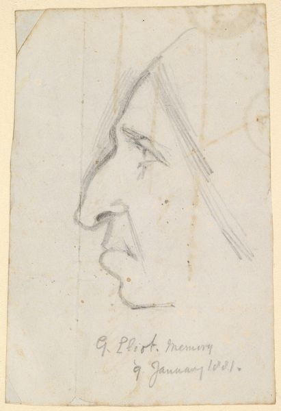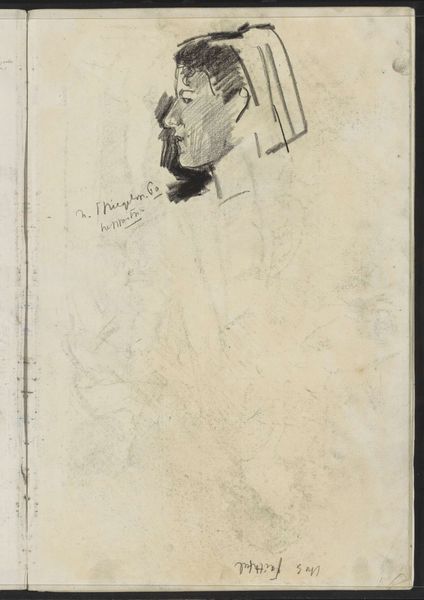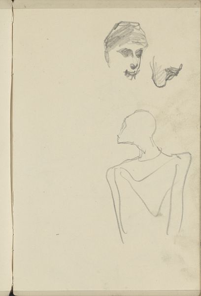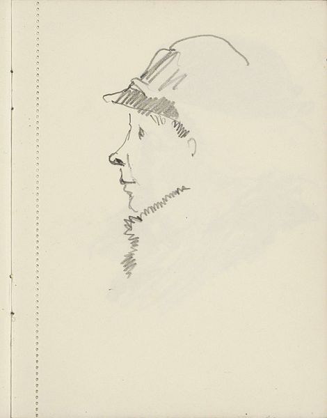 Curator: Immediately, I notice a vulnerability, a stark and fragile quality about it. Editor: Indeed. We’re looking at “Kop,” a pencil drawing by Carel Adolph Lion Cachet, dating from around 1897-1898. It’s held here at the Rijksmuseum. What strikes me is how quickly we tend to dismiss drawings as preliminary steps, rather than finished works in their own right. Curator: Precisely! And what story does the surface tell us? Look at the texture of the paper, the visible graphite smudges. These are all clues to how it was made, the artist’s hand at work, the materials consumed. It suggests immediacy. A thought captured. Editor: Yet this sketch, this "thought captured" as you call it, enters into a larger history of portraiture. How does a self-portrait such as this negotiate the relationship between the artist, the subject, and, of course, the marketplace? Whose gaze are we, the viewers, invited into? Is it one of introspection? Curator: More to the point, how accessible were these materials, who was encouraged to use them and in what contexts? Thinking about the production itself reframes our understanding of “fine art” practices. This pushes at established hierarchies within artistic training. Editor: True, but consider how Cachet's institutional training might have shaped his practice. Did formal conventions restrict his material explorations or, perhaps, ironically facilitate them? And what of its eventual public display and consumption in a museum, does that legitimize the "sketch" quality as artistic intent? Curator: Maybe it is legitimizing or maybe institutions just absorb what are always experiments, provisional activities that generate new approaches to representation that inevitably escape those conventional contexts. Editor: Fair enough. It highlights, then, the fluid relationship between art production, institutional framing, and how we, the public, understand something seemingly simple as a pencil drawing. Curator: Exactly, this artwork speaks to value, artistic labor, the lifecycle of materials and a challenge to static definitions. Editor: Thank you for reminding us to not overlook the subtleties of art. And also for reminding us of all the histories we can unveil.