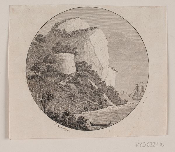 Curator: I find something quite melancholy in this scene. The misty sky and the rugged coastline create a sense of isolation. Editor: This is John 'Warwick' Smith's "Otranto, Bay of Salerno," now part of the Tate Collections. Curator: Smith's life was marked by financial difficulties, and one wonders if that struggle manifests in the somber tones and the lone structure perched precariously on the cliff. The crumbling fortress becomes symbolic of resilience in the face of adversity, mirroring the challenges faced by marginalized communities who must find strength in their own structures. Editor: The watercolor technique itself is quite interesting. See how the washes of color bleed into one another, creating soft transitions that evoke a sense of atmosphere. Curator: Absolutely, it's the play of light and shadow that gives it such emotional resonance. Editor: Indeed, a poignant reminder of art's capacity to reflect and refract human experience. Curator: It certainly leaves a lasting impression, prompting one to consider the broader narratives of power, resilience, and historical context.