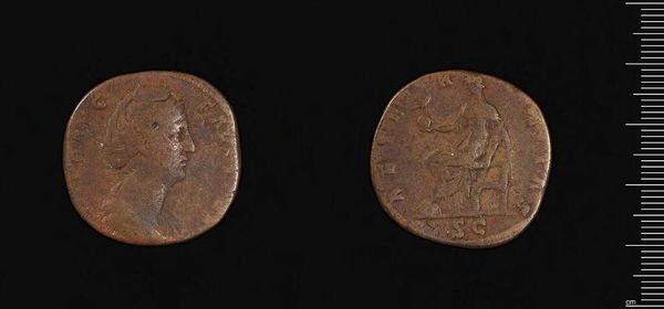 Editor: Here we have a sestertius, a Roman coin, depicting Faustina the Younger. It's lovely, but I wonder about the imagery used on coins like this. What meaning would the images have for people? Curator: The imagery speaks volumes. The portrait of Faustina presents an idealized version of her, reflecting imperial power and virtue. On the reverse, the seated figure embodies a concept, perhaps Pax, Concordia, or another imperial virtue. Editor: So, it’s not just money but propaganda? Curator: Precisely! Symbols and images, carefully chosen, would resonate with the populace, reinforcing cultural memory and imperial ideology. Consider how potent these images were, circulated and exchanged daily. What do you think that says about the power of iconography in ancient Rome? Editor: That’s fascinating. I hadn't thought about how impactful everyday objects could be. Curator: Coins weren't just currency; they were portable symbols of power and cultural identity.