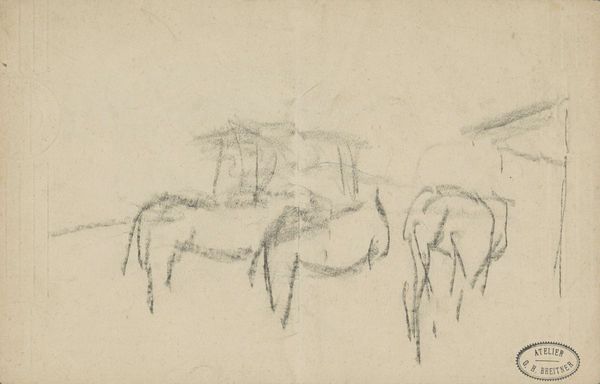 Curator: This is a study, possibly of a landscape with horses, by George Hendrik Breitner, dating from around 1886 to 1890. It's currently housed here at the Rijksmuseum, rendered in pencil. Editor: It’s such a whirlwind! My first thought is how evocative those stark lines are—almost like capturing a fleeting moment with barely a breath. Raw energy there. Curator: Absolutely, and it’s fascinating when you consider Breitner’s overall artistic production. This sketch, almost spartan in its economy of line, is born from intense material observation of the industrialized cityscapes he loved to paint. Think of the rapid urbanization of late 19th-century Amsterdam and the need to capture the ephemeral. The very material reality of the modernizing world is laid bare. Editor: So it's less about idealized rural life, more about the pulse of a city reflected even in a landscape sketch? There is an immediacy to the impressionistic style he uses. It is like catching a glimpse. Is that horse even really *there*? It's like a ghost of a horse. Curator: Precisely! The "landscape" isn't a pastoral escape, but another facet of modernity—perhaps horses pulling trams or goods through a burgeoning city. The sketch would have been created using readily accessible and relatively cheap drawing materials—pencil and paper— making it a very efficient way to document scenes and try out compositions. Editor: And the open, unfinished feel? Deliberate choice or an artifact of his creative method? Did he show and sell his sketches, or were these preparatory work in private? Curator: That's the interesting thing, isn't it? It certainly leaves that impressionistic 'unfinished' effect, opening a debate on if it was preparatory and then exhibited later on. Either way, the rapidness of technique points at modern themes. Editor: A lot to chew on. This image captures that transitional feeling--city transforming to something that will later feel utterly contemporary to us. I think I'll go mull that over for awhile. Curator: Indeed, the sketch serves as a valuable material testament to a transformative moment in history. I appreciate how considering production makes visible something deeply interesting about not just what's being created, but how, where, when and with what resources!