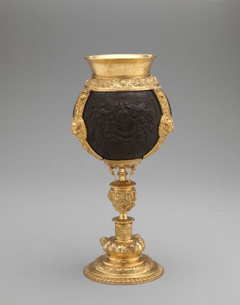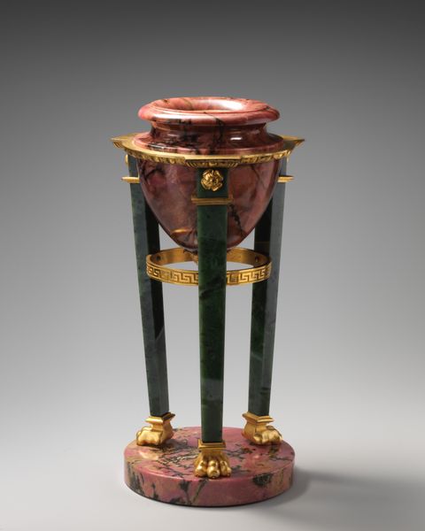 Curator: Here we have an intriguing artifact: a black lacquered candlestick, crafted from bronze or metal before 1812, adorned with delicate floral patterns. Editor: It strikes me as somewhat austere, even gothic, despite the flowers. The tall, columnar form combined with the black lacquer gives it a solemn feel, punctuated by those small, almost hesitant, floral designs. Curator: Indeed, the juxtaposition is compelling. Consider the symbolic weight of light itself: historically, it's represented enlightenment, hope, even divinity. This candlestick, designed to hold that light, becomes a vehicle for profound concepts. Editor: The flowers then take on added significance. In contrast to the dominant black, these motifs may carry emotional cultural or even spiritual symbolism. Could these painted flowers represent hope? The persistence of beauty even in the face of… well, darkness? Curator: It’s worth noting how the basic structure mimics classical architectural columns. This echoes through art history; that sturdy base supports this symbolic world. The patina suggests use. Each imperfection tells its own story. Editor: Perhaps each flower marks an event, or symbolizes a specific sentiment held by its owner? Each petal, each brushstroke contributes. And given that the candlestick’s materiality and making indicates decorative-art alongside baroque stylistic tendencies… one really can't help but think about the narratives it has illuminated. Curator: A wonderful image conjured. The object then becomes a mirror reflecting the lives and stories it has touched across generations, a humble vessel holding untold volumes. Editor: It definitely brings so many stories into perspective. Thanks to decoding the candlestick, its unique qualities truly reveal a cultural memory.
