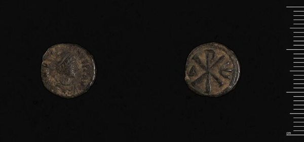 Editor: Here we have a Pentanummium of Justin I from Constantinople. It's a small, worn coin, but it feels weighty with history. I'm curious about the cross symbol on one side. What can you tell me about that? Curator: Ah, yes, the cross. It's not just a cross; it's a Chi-Rho, one of the earliest Christian symbols. It fuses the Greek letters Chi and Rho, representing Christ's name. It’s appearance on the coinage of Justin I signals the growing power of Christian symbolism in the Byzantine world. What does this symbol evoke for you? Editor: It makes me think about power and faith, maybe even a claim of divine right to rule. I hadn't thought about it as a declaration. Curator: Precisely. It's a powerful statement of faith and authority. These symbols are how societies speak across centuries. Editor: That's fascinating. I'll definitely look at coins differently now.