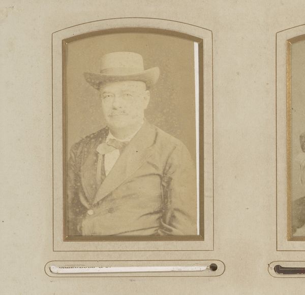 Curator: Welcome. Here we have a mounted portrait photograph of a gentleman with an impressive mustache, dating from between 1880 and 1905. It’s currently held in the collection of the Rijksmuseum. The sitter is thought to be Herman Salzwedel. Editor: There’s a quiet intensity to his gaze. He looks both elegant and like he might be slightly bored with the whole affair. All that meticulous posing just for one image! Curator: Yes, the framing contributes significantly to the reading. The photographer employs a very classical oval frame, which immediately positions the image within established portraiture conventions of the time. Note the careful distribution of light, particularly the way it highlights the sitter’s features. Editor: And that bowtie! Such precise geometry. I’m drawn to the tiny details: the watch chain draped across his waistcoat, the slight upward tilt of his mustache, those thoughtful eyes... It's more than just a likeness; it's a story hinted at in the stillness. I find it charming, in a stuffy sort of way. Curator: Consider, too, the compositional balance—the weight of the head and shoulders within the oval creates a harmonious structure, and the tones transition smoothly across the image. The textures within the photograph are subdued. The sepia tones also place this image firmly in a past era. Editor: Sepia dreams... I can almost smell the developing chemicals in the darkroom and hear the clicking of the camera shutter. The photographer really captured the essence of a man, probably prominent. All those serious portraits in that era, there’s still something that makes you think and makes him individual and a bit more unique. Curator: Precisely. By examining these elements, we gain a deeper understanding not only of the individual depicted but also of the cultural and artistic contexts in which this work was created. Editor: Absolutely. I see a moment captured, and it reminds me that every photograph, however formal, has an element of someone expressing what makes a character special in themselves.