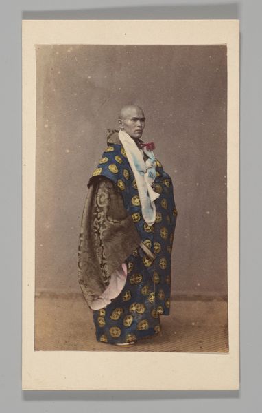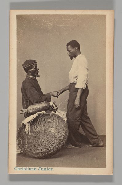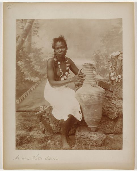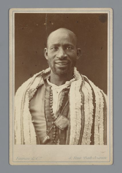 Editor: Here we have "[Studio Portrait: Woman with Straw Basket, Algeria]" from Maison Prod'hom, dating from the 1860s to 1870s. It’s a photograph, currently residing at the Met. I’m really struck by the woman’s direct gaze, almost challenging the viewer. What layers do you see within this photographic portrait? Curator: The gaze is indeed central. But let's also consider what the image _presents_ and what it might _conceal_. The straw basket, the bread – these are everyday objects, seemingly simple. Yet, in the context of colonial Algeria, they carry considerable weight. Do you think they tell a story about trade, labor, or perhaps something else? Editor: Possibly daily life and sustenance, the basic elements? But in what ways are these things charged objects, beyond the immediately visible? Curator: Precisely. Bread, universally, represents sustenance, community, and sometimes even religious significance. The basket suggests labor, possibly market trade. Think about how these objects might function as symbols of Algerian identity during French colonial rule, reflecting resilience. Do you get the sense of the photographer’s gaze imposing on the subject or is there perhaps resistance to that through how the woman presents herself? Editor: I see resistance now. The woman's strong gaze pushes back, reclaiming her identity instead of letting the photographer define it entirely. She’s not just a nameless Algerian woman, but an individual presenting _her_ self. Curator: Yes! The composition, seemingly simple, is a stage for complex power dynamics and enduring identity. The photograph becomes more than just a portrait, but a statement. Editor: It’s remarkable how much historical narrative and symbolic depth can be contained in such a seemingly straightforward image. Curator: Indeed, this photograph encapsulates cultural memory, bringing forward conversations that persist even today. We're always engaging in continuous dialogue through visual symbols like this photograph, questioning what we choose to remember and how.