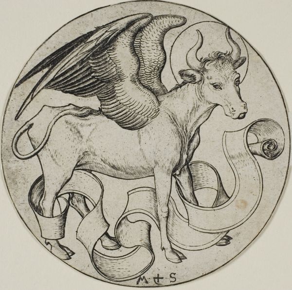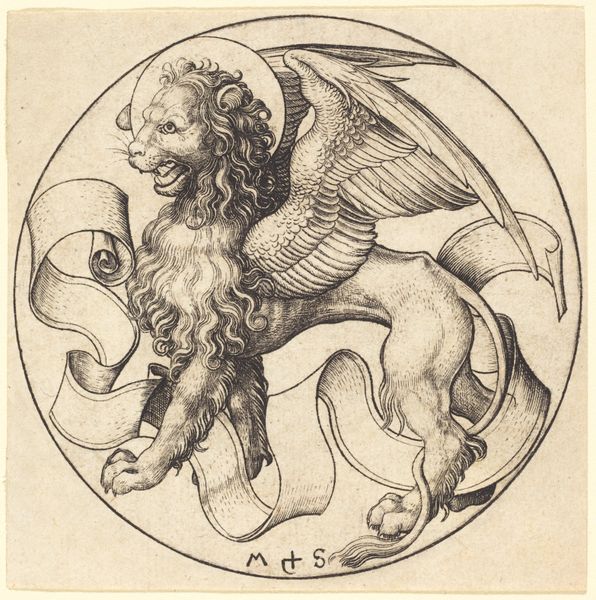Curator: What strikes me immediately is the sheer graphic intensity, that stark contrast. Editor: Indeed. Here we have Martin Schongauer's "The Eagle of Saint John," an engraving dating back to around 1490. Its detail is astounding, given the limitations of the medium. Curator: The medium is the message, isn't it? I am drawn to this precise labor of engraving, each line so deliberately etched into the metal. You can almost feel the physical process. But also, consider the function of these prints! They brought religious imagery to a wider audience. Editor: It's true. These prints democratized images to the late medieval society. What kind of skill would one need for metalwork, understanding how that pressure will carve in reverse into a copper or steel plate. Imagine creating all those fine lines manually... The eagle is almost vibrating. Curator: It’s that graphic sharpness you pointed out that captures the monumental style so characteristic of this time and place in European Art. Notice, for instance, how the folds and details are achieved via line weight variation that would have required an experienced eye on a sophisticated tooling. Editor: Absolutely. And the scale, we're talking about a relatively small print. I imagine this would be available as a more affordable version for mass consumption. Something devotional one could display, a source of artistic appreciation on one's wall. Curator: It’s not a copy or illustration per se. We cannot simply divorce "The Eagle of Saint John" from its socio-cultural background. By its inherent form as mass-produced religious propaganda, its purpose becomes quite interesting. Editor: I agree completely. Seeing the labor within it allows us to rethink "mass production" in different eras, appreciating each version because they had the hands-on-artisanal work etched upon them. Curator: It certainly gives one much to reflect on about devotional practices and the era’s technology. Editor: Absolutely. What an extraordinary piece that speaks volumes on material production, religious propaganda, and fine artistic skill all wrapped up in one!