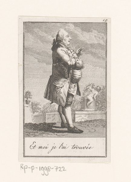 Curator: Here we have a rather curious engraving from between 1771 and 1823 by Karl Heinrich Grὕnler, titled "Vermoeide man," or "Weary Man." It's a striking, if somewhat melancholic, image rendered in a classic printmaking style. Editor: My first impression is…world-weariness. It feels like a study in ennui. The gentleman’s posture—slouched against the tree, the droop of his shoulders—speaks volumes about exhaustion, doesn't it? The gaze seems tired, indifferent. Curator: Absolutely. The title in French, "L'Homme blasé", highlights that feeling of jaded disillusionment, which resonated within certain segments of European society at the time. His clothing and walking stick suggest someone of means, yet he seems deeply unmoved by his surroundings. It becomes an interesting question of the source of the world-weariness - wealth, privilege, societal expectation? Editor: I’m immediately thinking about the social context of that period, though. Look at him, he's part of the bourgeoisie; therefore, we can infer this ennui as stemming from detachment due to class, or even being insulated from certain kinds of struggles and suffering, perhaps? It's a criticism of the aristocracy, and this particular social stratum who perhaps did not see or participate in "real" life as defined through the realities and plight of those living outside such wealth. Curator: Indeed, his fatigue becomes a commentary on a privileged class grappling with a loss of purpose, perhaps as older power structures began to give way to emerging social and political currents. It evokes images of decline but the symbolism feels incredibly layered - as if it can also act as a commentary on generational trauma - he could also just be tired, after all. Editor: Precisely. And the engraving style, with its delicate lines and crosshatching, only intensifies this effect. I wonder if this image reflects anxieties among the privileged about maintaining their relevance, as it also serves as a commentary on societal indifference through capitalism, as the fruits of one's labour often lead to a burnout similar to this "weary man." Curator: A potent visual statement on the burdens, and even ironies, of privilege at a moment of shifting societal values. Even if it's unintentional, these images resonate. Editor: It makes you think about how, through art, emotional and social commentary often exist within symbols and shared meanings we may otherwise ignore or take for granted.