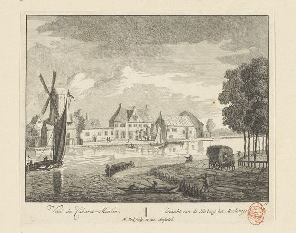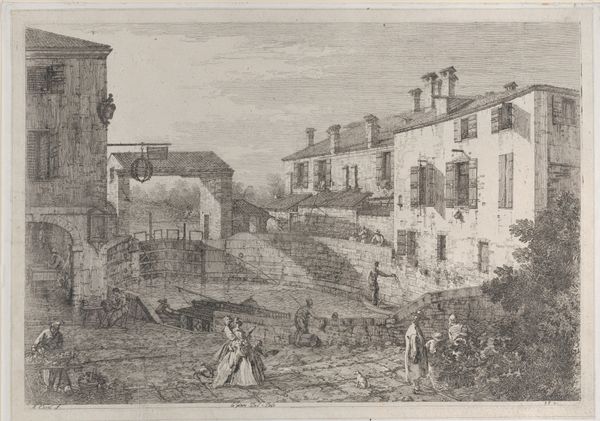 Editor: Here we have Nicolas Perelle's "View of the Baths of Bourbon-l'Archambault", dating from 1641 to 1695. It's an etching, and I'm immediately struck by how orderly and balanced the composition is, despite the busyness of the scene. What are your thoughts when you look at this, our expert? Curator: It is a rigorously organized scene, is it not? The composition is paramount. Observe the use of line and form to create depth. The linear perspective leads the eye, but does it lead towards a meaningful focal point, or a calculated construction? Note the geometric arrangement of the bath itself in contrast to the organic, seemingly accidental placement of figures throughout the image. What tension is created in that relationship? Editor: So you're saying the formal structure is almost fighting against the implied activity within the picture? Curator: Precisely. The etching medium allows for very precise detail, look closely at the architecture, it almost feels diagrammatic, while the people seem almost like an afterthought in their placement. Notice the contrasting textures, too— the roughness of the stone versus the implied smoothness of the water, adding another layer of complexity. Editor: I hadn’t considered the texture! It's like he's presenting an ideal, geometric world onto a realistic and busy one. That is really interesting. Thank you. Curator: The real charm of art lies within such interplay, the conversation it triggers regarding not merely ‘what’ something shows, but ‘how’ it does so. I hope to have kindled your own inquisitiveness towards pictorial architecture!