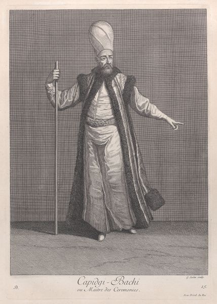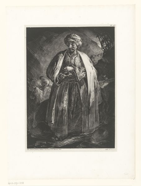 Curator: What a magnificent character study. I'm drawn to the meticulous detail, a veritable compendium of cultural signifiers rendered in watercolour and gouache. Editor: It has an undeniable exotic flair, a dreamlike quality. I immediately notice the theatricality of the gesture, the costume itself – rich in implied narratives. Who exactly is this figure? Curator: We're looking at Johann Georg Christoph Fries's "Costume Study for Bassa Selim in the 'Abduction from the Seraglio' by W.A. Mozart," created sometime between 1825 and 1835. This piece, now housed at The Met, offers a glimpse into the visual world surrounding Mozart's opera. Editor: Ah, so a product of its time and its socio-cultural milieu. It exemplifies orientalism. But the costume is so... vibrant, isn't it? Almost jarring in contrast to the man’s sombre face. It’s quite the paradox. What’s the psychological weight behind these design choices? Curator: Precisely! It invites an intriguing study. Notice the detail in the turban, the slight droop in the plume… It echoes traditional leadership regalia. Bassa Selim is presented as an exotic 'other', the 'oriental' ruler. Editor: And the dagger, casually tucked into his sash, acts as a clear visual signifier for potential menace, right? But at the same time, he strikes a somewhat elegant, theatrical pose. It highlights the performance, the opera, as a cultural spectacle itself. What could the original audiences of Mozart's work make of that image, a figure caught between brutality and gentility? Curator: The symbols here reveal a Western fascination with, and simultaneous othering of, the East. His robes, the turban—all coalesce to define the oriental. These are symbols not just of power, but of cultural difference. Editor: I find the costume a curious paradox, though: elaborate and exquisite, yet perhaps imprisoning its wearer within the confines of a stereotype. This representation of Bassa Selim reflects power dynamics of 19th-century Europe. It showcases art’s critical role in reflecting society, consciously or not. Curator: Indeed, a costume speaks volumes, it represents layers upon layers of symbolic messaging through its color and design, shaping an identity in the cultural memory of its viewer. Editor: Absolutely, this Fries study offers a rich glimpse into the complexities of cultural projection. Thank you, Johann Georg Christoph Fries, for the layers upon layers.