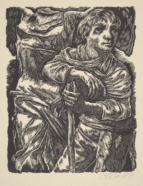 Curator: This stark image is entitled "Pieta," a print made circa 1934 by Jan Gelb. What are your initial impressions? Editor: Utterly bleak. The monochromatic palette emphasizes the raw sorrow etched onto the figures, their bodies intertwined in a tableau of grief. The use of stark contrasts only intensifies this mood. Curator: Indeed. Gelb’s choice of the Pieta theme, a common artistic subject depicting Mary cradling the dead Christ, is powerfully reinterpreted here, isn't it? Look at how she is drawing from religious art history to depict this devastating image. Editor: Absolutely, and consider how Gelb deviates from the classical composition. Instead of serene acceptance, we see unrestrained agony. Note how the jagged lines defining their bodies contribute to a sense of unease, while the chiaroscuro amplifies the somber and oppressive atmosphere. Curator: Placing this artwork within its historical context, during the interwar period, reveals another layer of meaning. As the social and political conditions deteriorated in Europe, many artists reflected the increased social issues and challenges within their own societies. Editor: The hanging noose visible in the background really contextualizes this subject. That subtle yet visually provocative symbol does not allow you to look away from the image's central focus. Curator: Yes, the noose undeniably situates the depicted grief and death within a framework of racial violence, referencing lynching and injustice against Black communities in the United States. Editor: Furthermore, examine how Gelb employs foreshortening to emphasize the lifeless body, making it jut outwards. Our eye is led towards the pain etched in the woman’s facial features and down to the bound feet, creating a visual loop that traps the viewer in a cycle of mourning. Curator: A poignant analysis. What resonates most for me is the artwork’s capacity to connect a specific historical tragedy with a timeless, universal expression of human suffering. Editor: Ultimately, the success of "Pieta" resides in its ability to utilize formal artistic techniques to create a deeply emotional and lasting socio-political commentary.